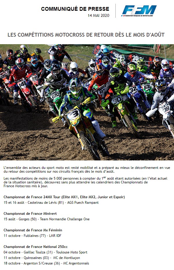 COMMUNIQUÉ DE PRESSE FFM : LES COMPÉTITIONS MOTOCROSS DE RETOUR DÈS LE MOIS D’AOÛT